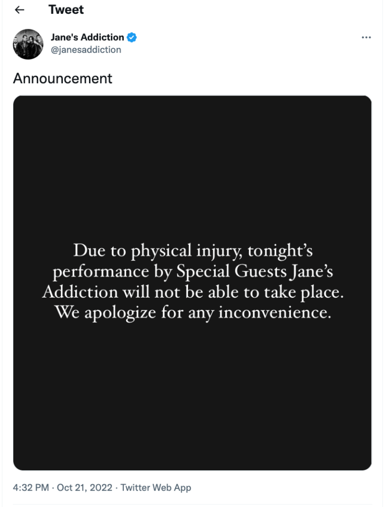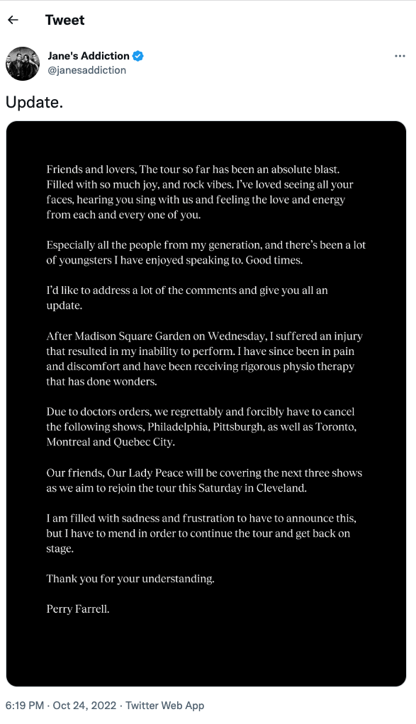 A few days later Farell then made a post addressing an injury he suffered while performing at Madison Square Garden. The band unfortunately had to pull out of multiple shows, which included Pittsburgh, Toronto, Montreal and Quebec City. With the tour still continues with Smashing Pumpkins, it was announced that Canadian rock bad, Our Lady Peace, will be performing in place of Jane’s Addiction for the next couple of shows. Fingers crossed the band won’t have to drop out the remainder of the tour. Wishing Perry a speedy recovery.